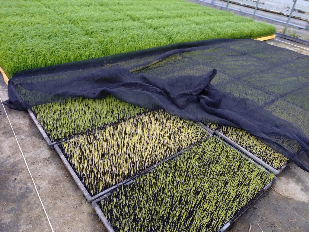 苗を育苗ハウスに移動し、寒冷紗で環境にならします 投稿日: 2026年4月15日2026年4月17日 投稿者: secretariat 苗が3cmほどに伸び、少し緑がかった苗を、育苗用のハウスに移動し、寒冷紗をベタ掛けして予備緑化を行いました。 1日ほどで緑になりましたので、寒冷紗を除去して、育苗を進めます。